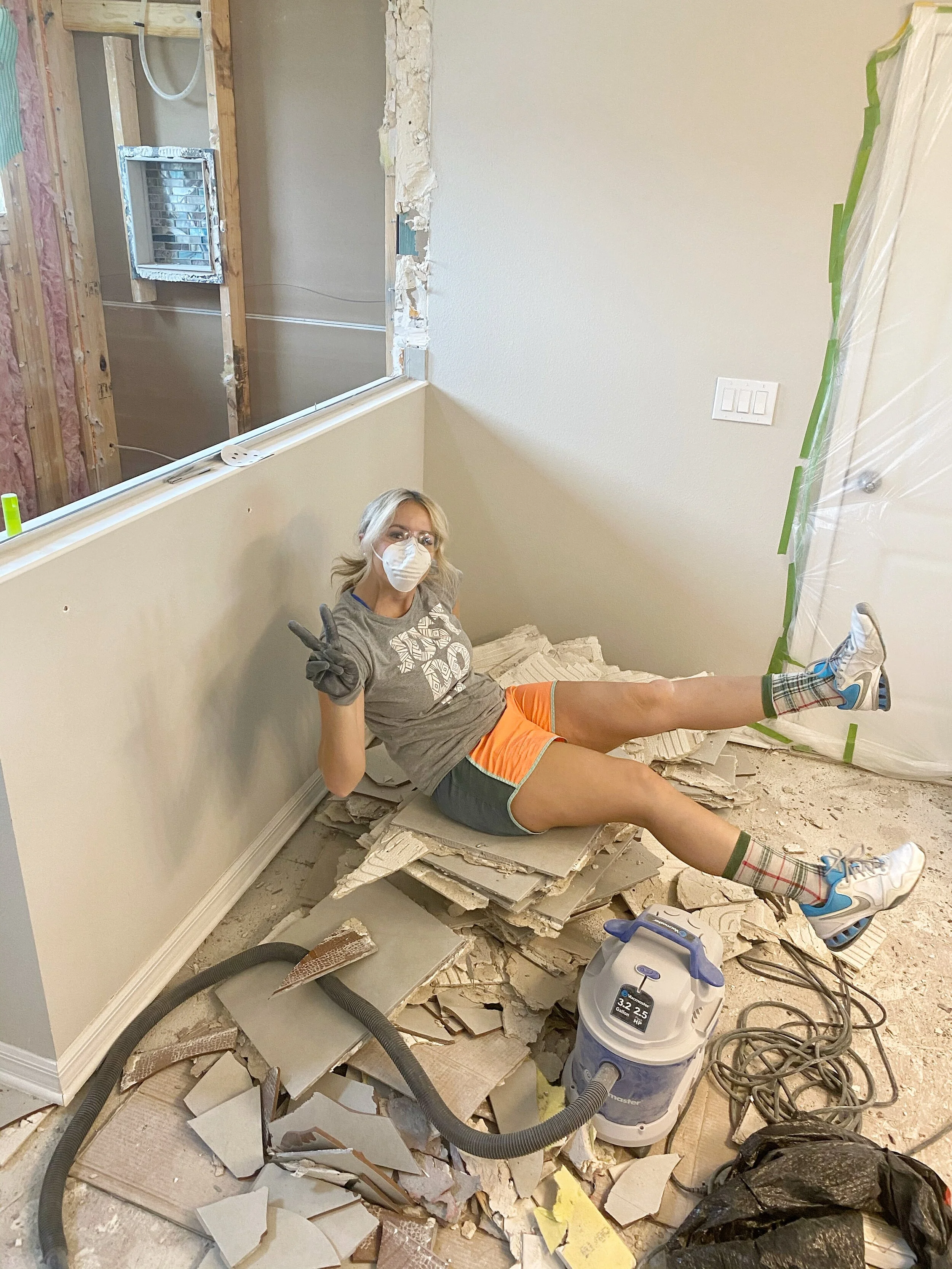 The first thing we needed to do was prep the space for demo. This meant taking out all of the decor, removing the towel bars and hooks, taking out the toilet, and removing that HEAVY shower glass. And when I say that shower glass was heavy, I mean it. I swear I saw my life flash before my eyes at least three times while we were carrying it. We also took off the old shower head and faucet as we’re going to be replacing those too. We also took off the cabinet doors and drawers so they didn’t get dusty, and then we covered all the doorways and countertops with plastic sheeting- Dexter style. It will get messy, so we definitely suggest this step any time you are removing tile. We also grabbed our safety gear which included our dust masks, safety glasses and cut resistant gloves-the tile gets sharp!